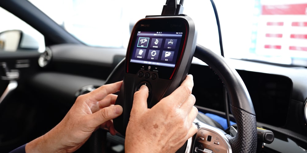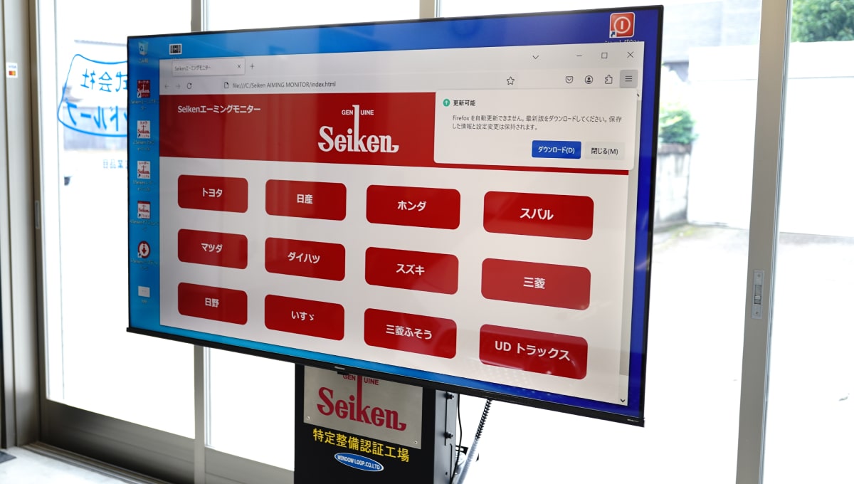 専用ツールで車両と接続し、カメラの調整作業を行います。